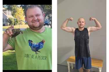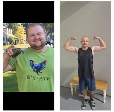 I started out January 20th 2025 at 314.7 pounds and got down in 7 months to 185.2 pounds. It's been a crazy ride and it's been tough but very much worth every ounce of effort. Rich helped me out a lot with helping me get my macros in the beginning right. I was good on keeping my protien intake at about a gram per pound but I was severely underrating fats and it not only effected my performance but mentality. He helped me change some food groups to get that fixed and I took off after that. I also had issues with working out as the weight dropped off of me cause something no one talks about when yoy lose some serious poundage is how you literally get more ROM and angles will change when you don't have all that fat getting in the way. Rich helped me with changing up some exercising or different techniques to better suit how my body was changing and it made a world of difference on my gains and especially on saving my already fucked up joints from any further damage caused by my morbid obesity. I genuinely can say this was life saving because at the start I was literally told that my weight was killing me and that my doctor didn't know if my heart could take anymore of my extreme weight. I had a resting heart rate in the 190s and a blood pressure so high it would make the machines flash red warning signs cause I was on the verge of a heart attack just sitting down. Now after loosing the weight I have a life again and do the things I love, ( not looking like the fat guy from the original jurassic park movie is also a pretty big plus ) genuinely can't say this enough thank you man you have helped me get my life back and now all I gotta do is get to building to hit my goal of 200 pounds lean. With all the support and comradery here I don't see it being to difficult. Below imma post the before after thus far.